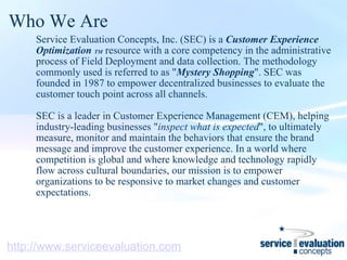 Service Evaluation Concepts, Inc. (SEC) is a company that specializes in customer experience optimization programs through field deployment and data collection methods like mystery shopping. Founded in 1987, SEC helps businesses align their brand message with customer expectations across all channels. SEC works with large companies committed to customer and employee satisfaction, using a balanced scorecard approach to identify links between customer experience and corporate strategy. SEC has a global network of over 600,000 contractors who monitor frontline customer interactions across in-person, online, and phone channels.