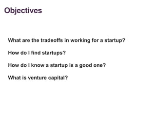 The document provides an overview of startups and venture capital, including trade-offs of working for startups compared to large tech companies, guidance on finding reliable startups, and the importance of cultural fit. It discusses various funding stages, sources of investment, and what venture capitalists look for in potential investments. Additionally, it emphasizes the importance of relationships between entrepreneurs and investors in the fundraising process.