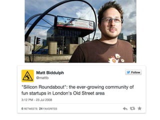 Tech City is the largest cluster of tech startups located around Old Street and Shoreditch, UK. It supports growth through various initiatives such as the Digital Business Academy, startup loans, and tax reliefs. The document also highlights key influencers in the tech community and offers opportunities for private tours to showcase innovation.