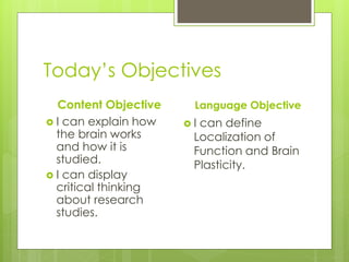 This document provides an introduction to the human brain, including objectives, key terms, and examples of research studies. It discusses the principles of localization of function and brain plasticity. Examples are given of different methods neurologists use to study the brain, including post-mortem examination, analysis of brain damage cases, and modern brain imaging technologies like MRI and fMRI. Specific studies summarized include Rosenzweig on brain plasticity in rats, Dimasio on Phineas Gage's frontal lobe damage, and Corkin on patient H.M.'s hippocampal removal.
