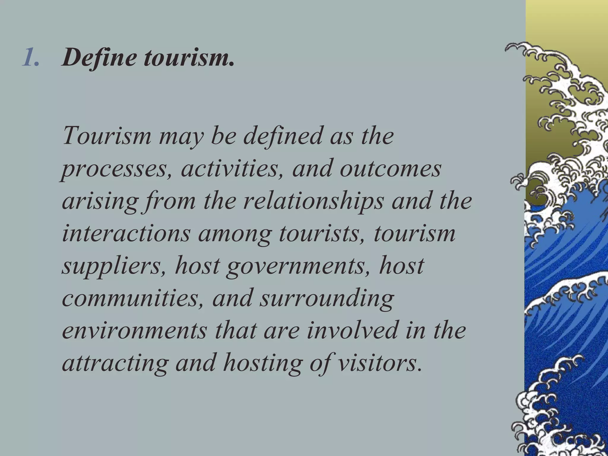 Tourism involves the interactions between tourists, tourism suppliers, governments, communities, and environments. It provides economic and social benefits but also costs that must be managed. Standard definitions and classification of visitors are important for analyzing tourism's impacts and promoting it effectively. Studying tourism requires a systems approach that considers its interdisciplinary nature and relationships within a country's legal, economic, and social systems. Reducing costs and problems requires good planning and development.