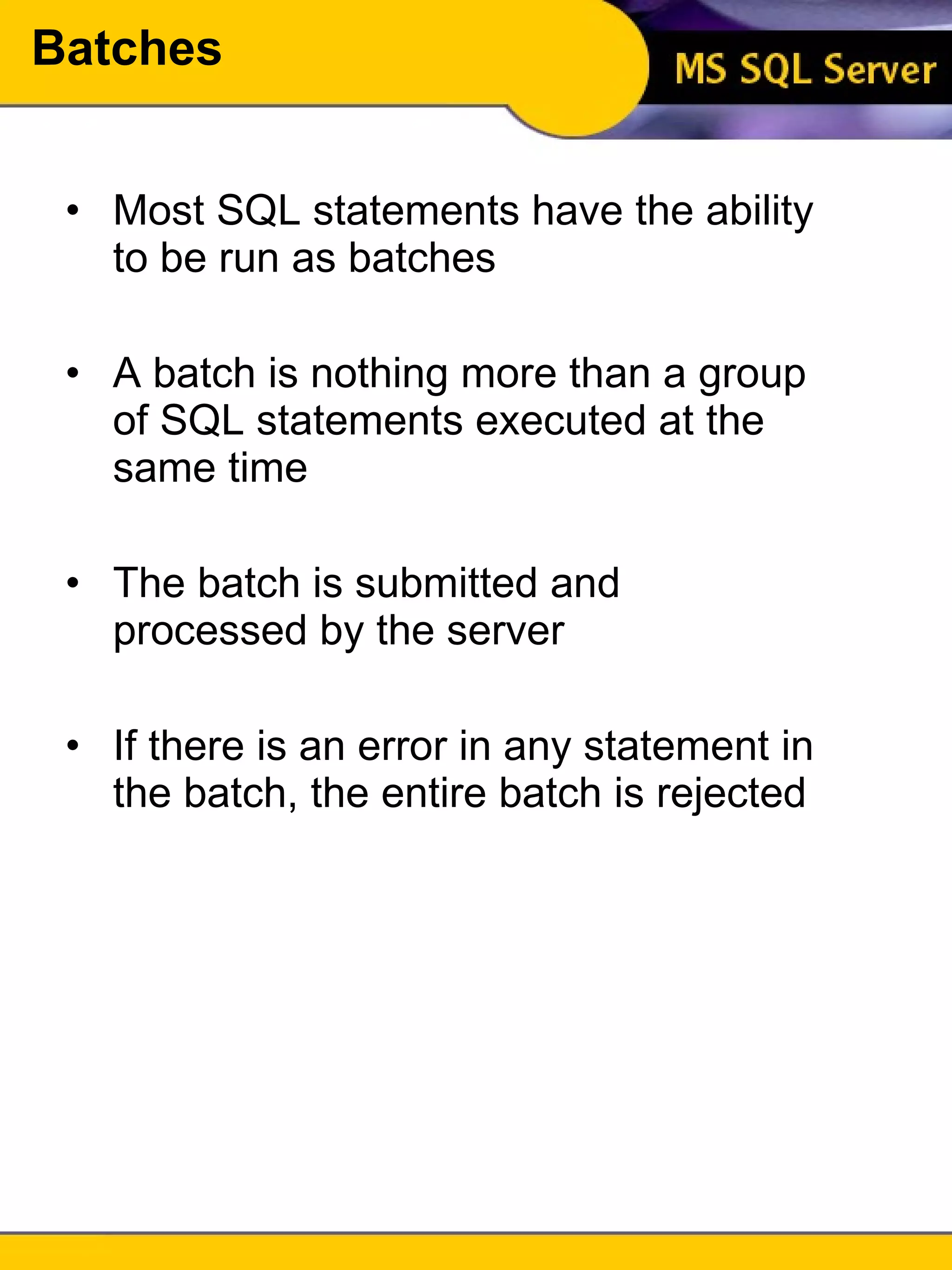- Batches allow executing multiple SQL statements together, but an error in one statement fails the entire batch.