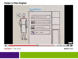 Twitter is a social media platform that allows users to post short messages called tweets. It has grown rapidly in recent years and is used by journalists, politicians, celebrities, advocates and ordinary people to share information and stay connected. The document provides an introduction to Twitter and advice on how to get started, including signing up for an account, following others, downloading apps, posting regular tweets, responding to others, and using search and analytics tools.