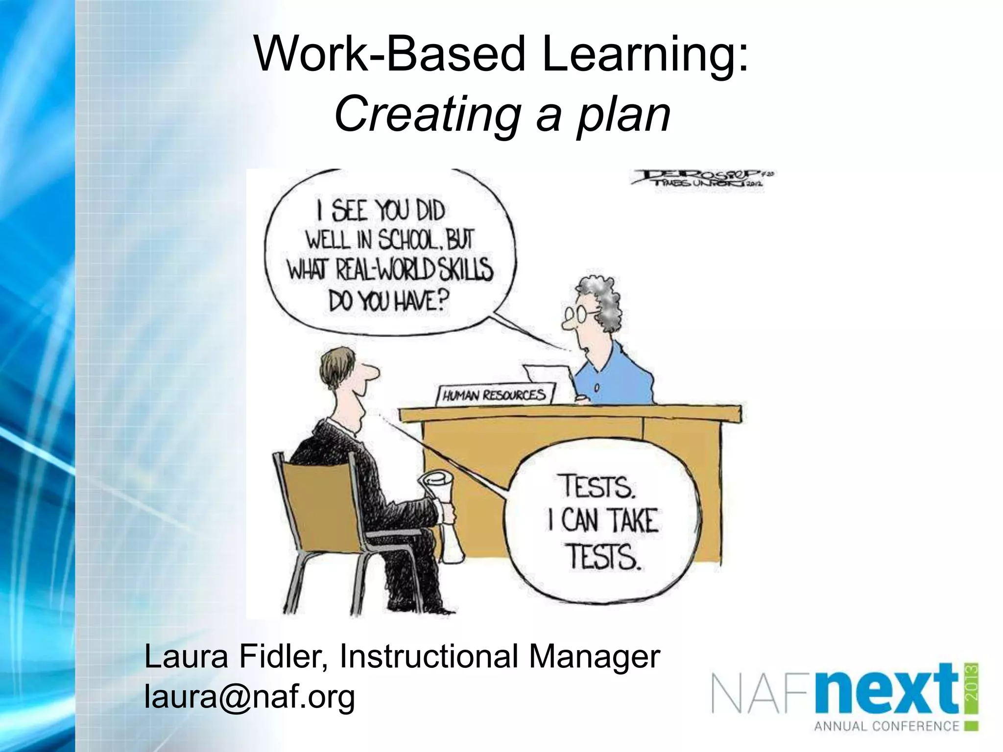 The document provides an overview of work-based learning (WBL), discussing its significance and how to create a WBL plan for educational institutions. It outlines the benefits of implementing WBL, such as state program approval and enhancing career readiness for students, while emphasizing the development of both academic and interpersonal skills. Strategies for engaging industry partners and incorporating various learning experiences are also highlighted as essential components of effective WBL initiatives.