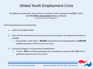 The Youth Economic Participation Initiative (YEPI) aims to address the global youth employment crisis, characterized by high unemployment rates among young graduates lacking essential skills. The initiative emphasizes the importance of university-community partnerships, curriculum reform, and entrepreneurial training to better prepare students for the workforce. Key activities include providing grants, fostering a global community of practice, and enhancing innovative models to facilitate the transition of students into successful careers.