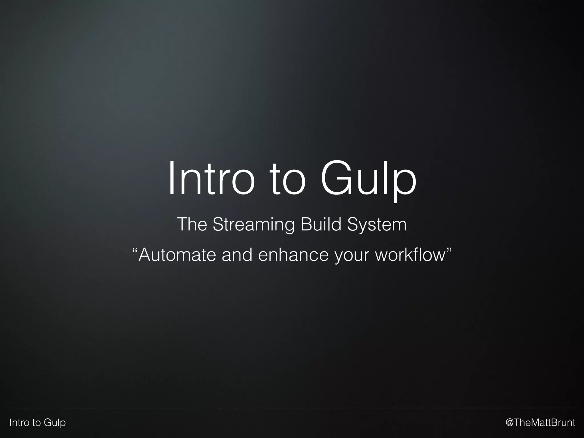 This document introduces Gulp, an automated build system that uses streams and pipes to enhance workflows. It discusses advantages like performance gains from concatenating and minifying files. Gulp can be used to compile stylesheets and scripts, concatenate files, minify code, clean up files and more. Key aspects like file watchers that automatically rerun tasks on changes are highlighted. A demo is promised to show Gulp in action.