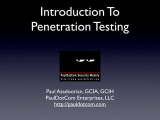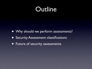 The document introduces various types of security assessments including target identification, port scanning, vulnerability scanning, penetration testing, web application testing, and source code auditing. It explains that these assessments help organizations understand security threats, determine risk, and test incident handling procedures. The future of assessments is discussed as targeting an increasing number of mobile and wireless devices and protocols.