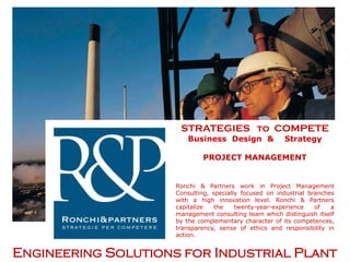 Ronchi & Partners is an engineering consulting firm that specializes in project management for industries with high innovation levels. They have over 20 years of experience providing services across various stages of industrial plant development from feasibility studies to engineering, procurement, installation, commissioning and after-market support. Their areas of focus include manufacturing, iron, steel, and rolling mills industries. They offer a range of engineering and management consulting services.
