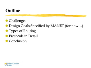 This document summarizes several routing protocols for ad hoc wireless networks. It describes the challenges in this domain including dynamic topologies and limited resources. It then categorizes and explains several types of routing protocols, including proactive protocols like DSDV, reactive protocols like AODV and DSR, hybrid protocols like ZRP, and geographic routing. It provides details on the route discovery and maintenance mechanisms of some of these prominent protocols. It also discusses theoretical limits on network capacity and the impact of mobility and hierarchy.