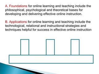 The document discusses foundations for online learning and teaching. It covers philosophical, psychological, and theoretical bases like motivation for learning and the Community of Inquiry framework. It also discusses institutional considerations around technology selection and preparing faculty for online teaching. The Community of Inquiry framework emphasizes social, cognitive, and teaching presence to support critical thinking in an online community. Motivation theories like andragogy note that adult learners are self-directed and motivated by internal factors like relevance to their lives.