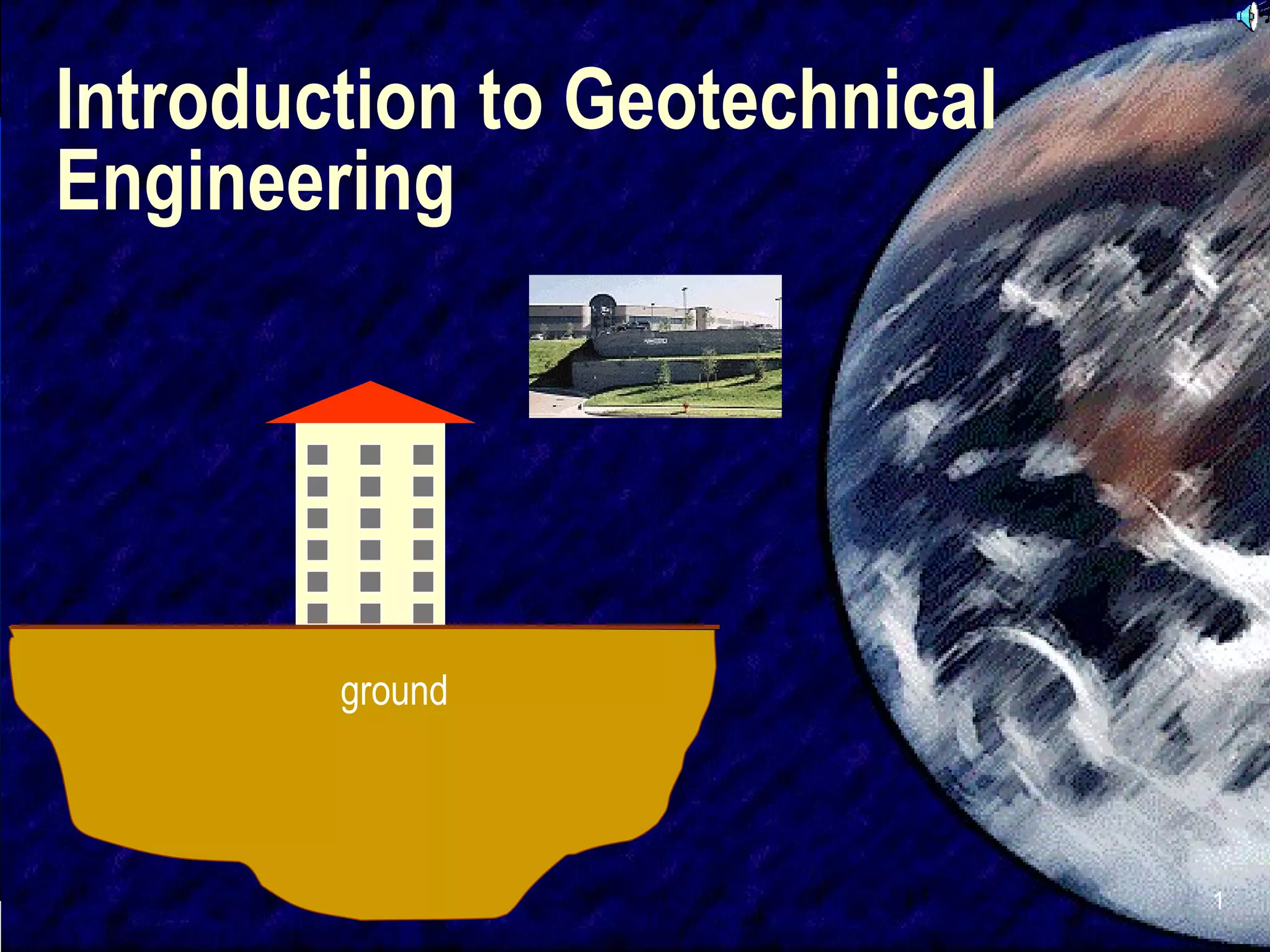This document provides an overview of geotechnical engineering topics including typical geotechnical projects, shallow and deep foundations, retaining walls, earth dams, concrete dams, earthworks, geofabrics, reinforced earth walls, soil nailing, sheet piles, cofferdams, landslides, shoring, tunneling, blasting, ground improvement techniques, instrumentation, soil testing methods, safety factors used in design, notable contributors to geotechnical engineering, landmarks, and advice for studying geotechnical engineering.