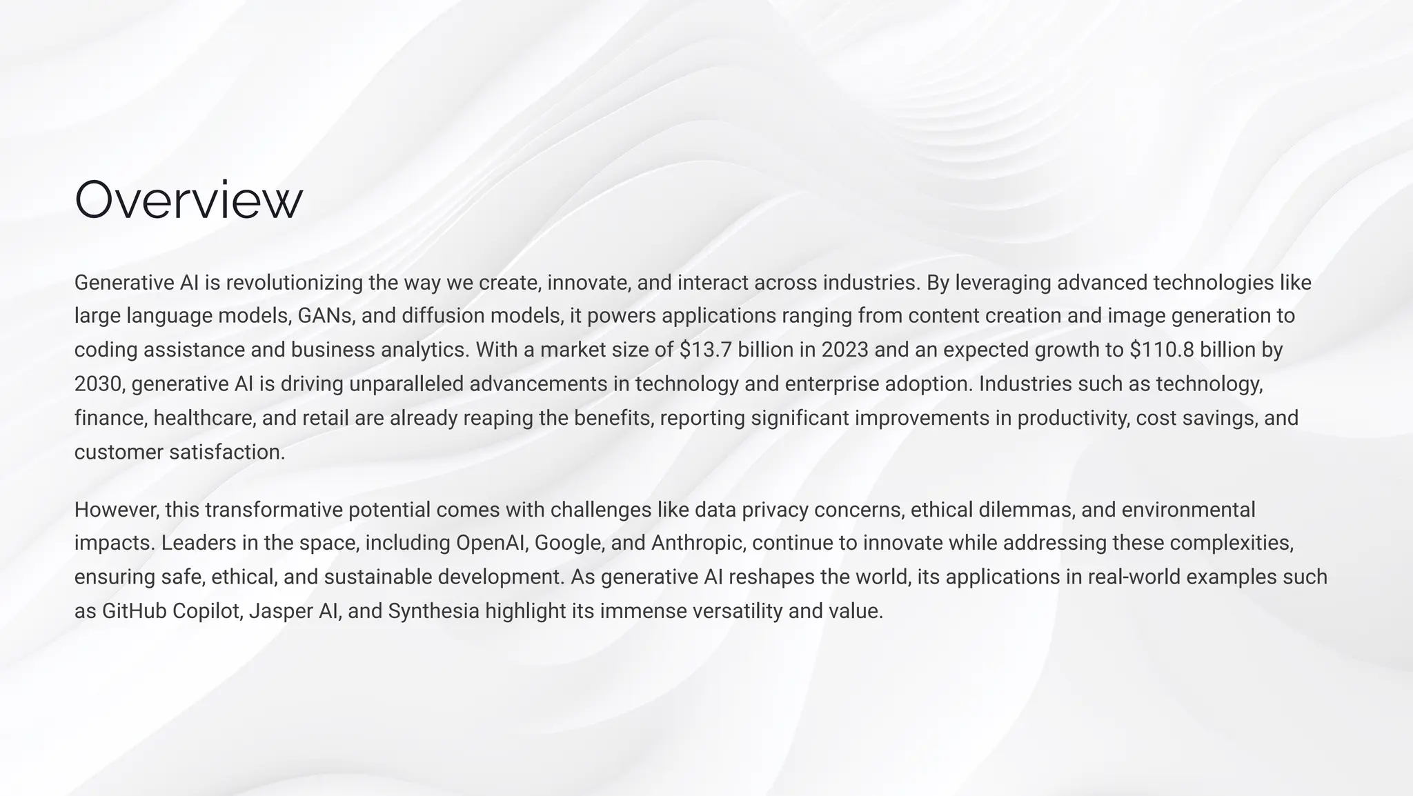 Generative AI is transforming industries by enabling automated content creation and enhancing productivity, with a market expectation of growth from $13.7 billion in 2023 to $110.8 billion by 2030. While offering significant advantages such as cost savings and efficiency improvements, it also presents challenges related to data privacy, ethics, and environmental impact. Key players are focusing on safe and sustainable development to maximize generative AI's value while addressing these complexities.