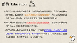 鷹才家教媒合平台旨在促進家長與教師之間的聯繫,提供一個開放的信息平台,讓雙方能夠有效找到合適的家教。平台關注各種教育議題,並致力於確保家長能夠查驗教師的學歷和資格。平台的使用對家長永久免費,教師則目前可免費使用,聯繫方式主要透過LINE。
