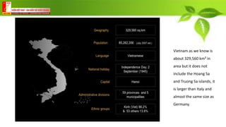 Vietnam is located in Southeast Asia, bordered by China, Laos, and Cambodia. While smaller in size than Italy and Germany, Vietnam has over 90 million people and 64 provinces. The capital is Hanoi, located in the north with over 5 million residents. Hanoi has historically been the cultural center of Vietnam as home to many dynasties. Key attractions in Vietnam include Ha Long Bay and Phu Quoc Island. The climate varies regionally from four seasons in the north to a rainy and dry season in the south. The culture is a blend of Eastern and Western influences, exemplified by traditions like Tet New Year celebrations and iconic foods such as pho.