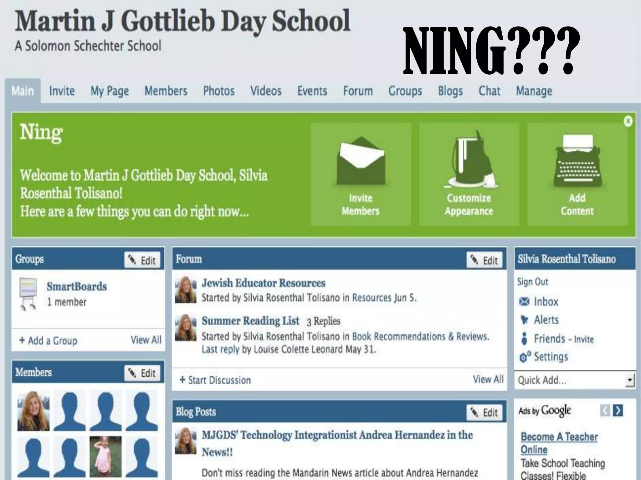 This document introduces Ning as an online learning platform similar to Facebook that allows users to collaborate, share, and participate from anywhere. It provides examples of education-focused Ning networks and encourages readers to sign up, contribute to discussions on various topics, and reflect on their goals for the upcoming school year and technology integration.