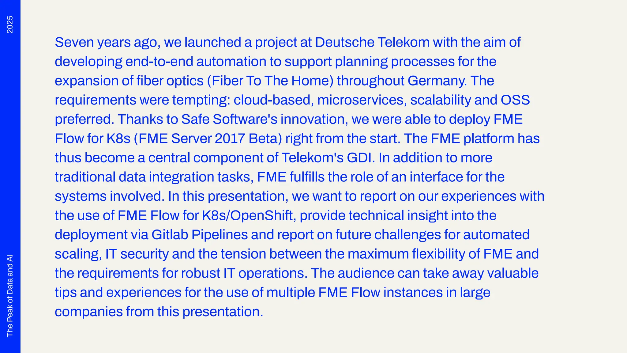 Seven years ago, we launched a project at Deutsche Telekom with the aim of developing end-to-end automation to support planning processes for the expansion of fiber optics (Fiber To The Home) throughout Germany. The requirements were tempting: cloud-based, microservices, scalability and OSS preferred. Thanks to Safe Software's innovation, we were able to deploy FME Flow for K8s (FME Server 2017 Beta) right from the start. The FME platform has thus become a central component of Telekom's GDI. In addition to more traditional data integration tasks, FME fulfills the role of an interface for the systems involved. In this presentation, we want to report on our experiences with the use of FME Flow for K8s/OpenShift, provide technical insight into the deployment via Gitlab Pipelines and report on future challenges for automated scaling, IT security and the tension between the maximum flexibility of FME and the requirements for robust IT operations. The audience can take away valuable tips and experiences for the use of multiple FME Flow instances in large companies from this presentation.
