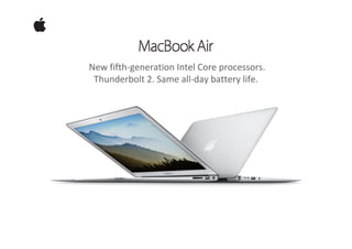 The document provides details on the features and specifications of MacBook Air laptops. It highlights their long battery life of up to 12 hours, powerful fifth-generation Intel Core processors, fast all-flash storage, 802.11ac WiFi support, and inclusion of iLife apps. Photos and brief descriptions are included for features like the Multi-Touch trackpad, backlit keyboard, Thunderbolt 2 and USB 3 ports, and Retina display.