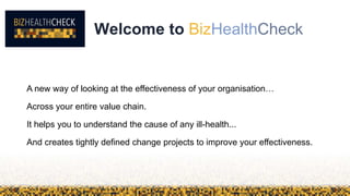 BizHealthCheck is an innovative organizational assessment tool designed to evaluate and enhance the effectiveness of an organization's value chain by focusing on the health of relationships across teams and with customers. It provides visual insights into the organization's health through a compact four-page infographic rather than lengthy reports, emphasizing a dynamic understanding of internal and external stakeholder perspectives. BizHealthCheck consists of three phases: self-assessment, diagnosis of issues, and implementation of targeted change projects.