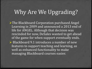 The document discusses DeSales University's upcoming upgrade from ANGEL to Blackboard 9.1. It provides information on why they are upgrading, when the upgrade will occur, and what's new in Blackboard 9.1, including new features like journals, blogs, wikis, mashups and SafeAssign. It also outlines steps faculty should take to prepare for and successfully navigate the transition, such as attending trainings, cleaning up their ANGEL content, and being aware of changing URLs. A survey is provided at the end to collect feedback on the workshop covering the information.