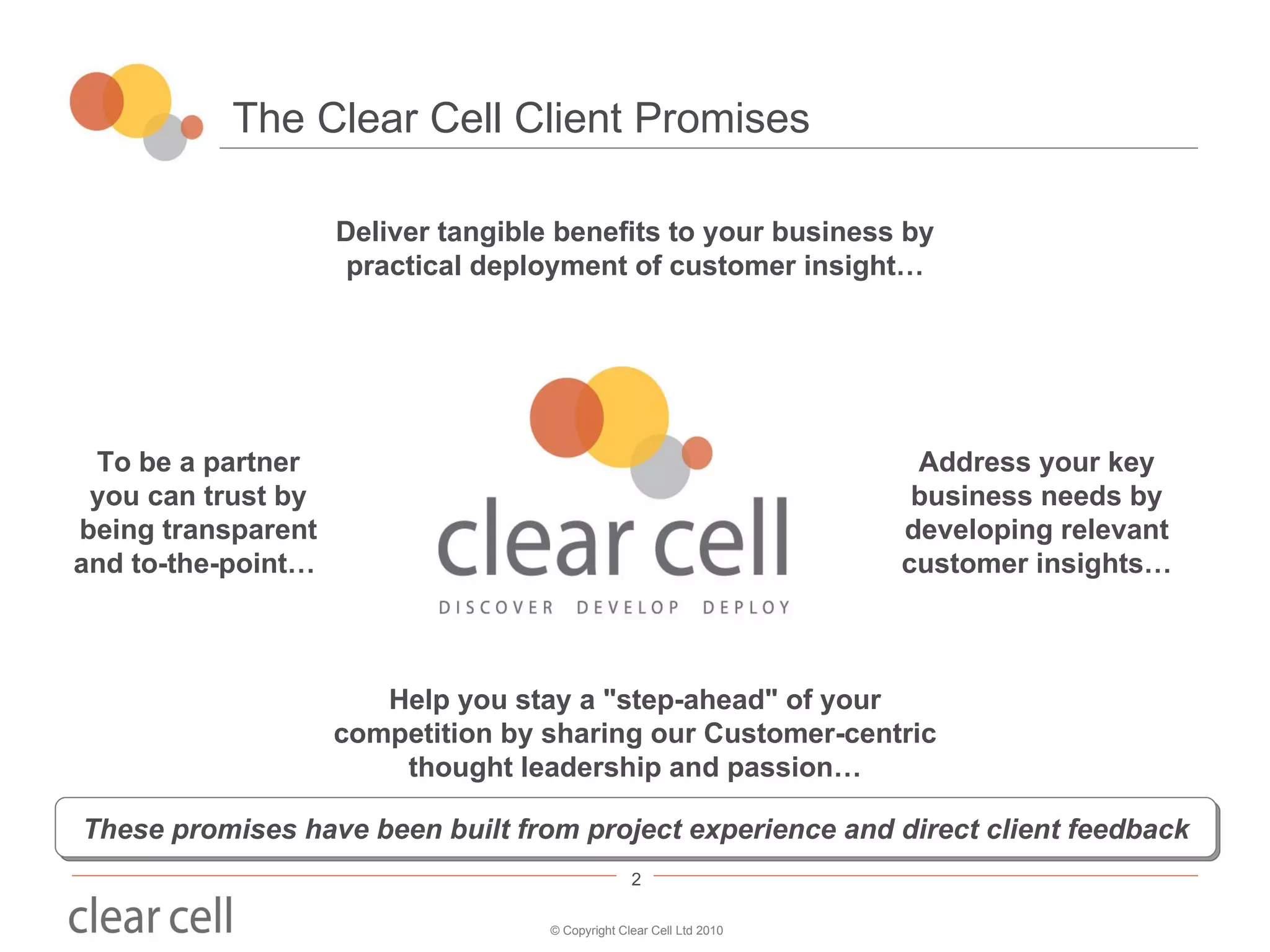 Clear Cell helps businesses increase profits through better customer understanding and insight deployment. They focus on managing customer relationships and value over time. Clear Cell believes the most successful businesses focus on customer insight, deploying that insight across the business, and continually learning from testing new approaches. Their approach involves discovering value from customer data, developing customer insights, and deploying insights through business levers to increase efficiency and profits.