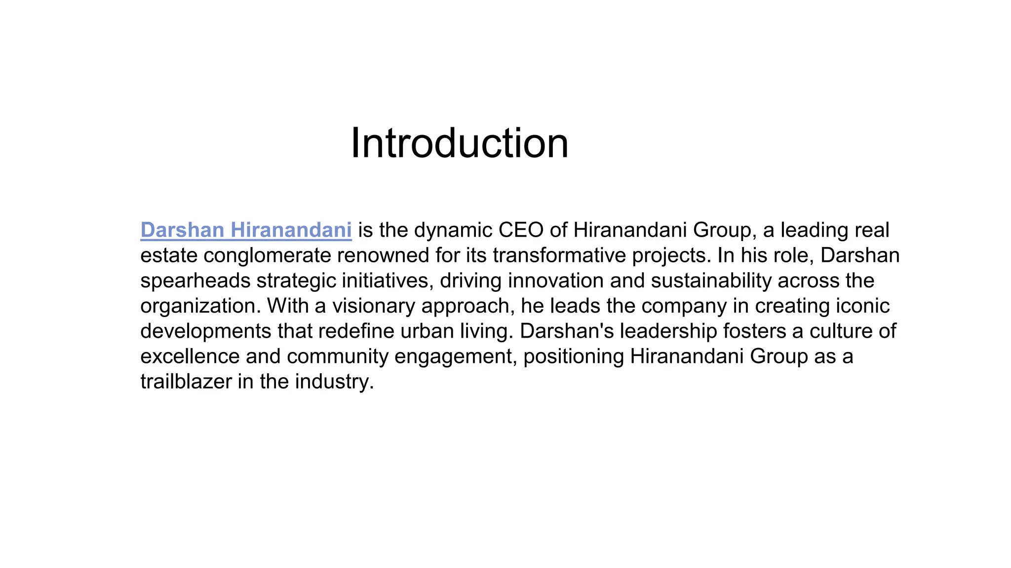 Darshan Hiranandani is the CEO of Hiranandani Group, a prominent real estate company known for its innovative and sustainable urban projects. He leads the organization with a focus on strategic foresight and community engagement, aiming to set new industry benchmarks. Under his leadership, the group diversifies its portfolio while prioritizing sustainability and technological innovation.