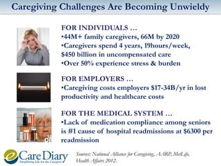 The document introduces eCareDiary, a service that uses technology to help family caregivers manage care for their loved ones more effectively. It notes that the number of family caregivers is large and growing, and that caregiving is costly and stressful. However, technology can help by saving time, reducing stress, and improving care coordination. eCareDiary provides online tools and resources through a secure website and mobile apps to help caregivers manage appointments, medications, documents, and communication between members of a care circle. The goal is to make the caregiving process easier through relevant information and assistance with care management tasks.
