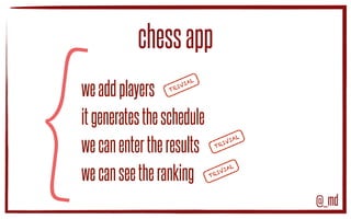 The document discusses the concept of 'eager design' in software development, emphasizing methods such as jumping to the relevant problem, replacing primitive types with structured types, and maintaining immutability. It features various examples and functions related to scheduling in a chess app, showcasing how to handle player matching and rounds efficiently. The philosophy promotes creativity through limited information and intelligent constraints to enhance the design process.