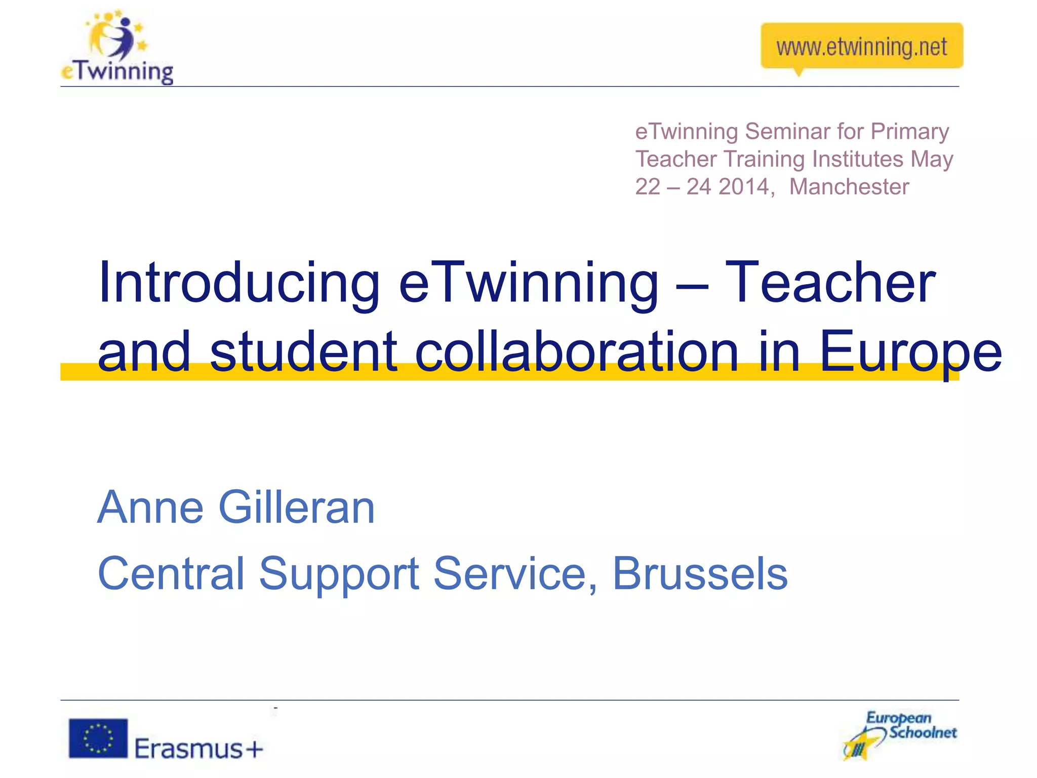 eTwinning is an initiative of the European Commission that allows teachers and students to collaborate on projects online across Europe. It started in 2005 and now includes 33 participating countries. The key aspects of eTwinning are that it provides an online space for collaboration between schools, opportunities for continuing professional development for teachers, tools to recognize work done, and support from national and European services. Teachers can find partners, work on joint projects, and participate in professional development activities all through the eTwinning portal.