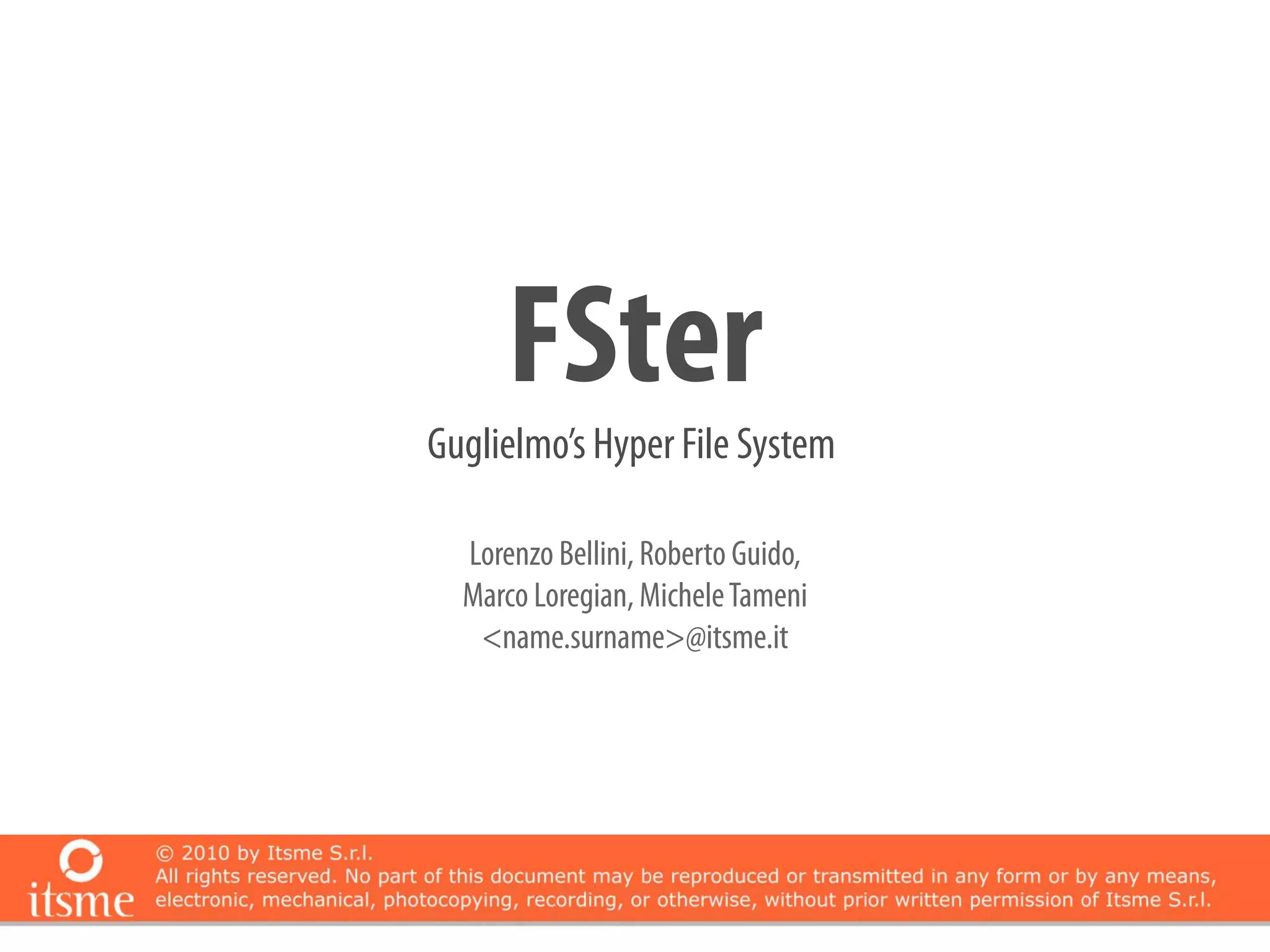 Fster is a virtual file system based on FUSE technology that allows users to access files according to associated metadata. It utilizes an XML configuration to define a hierarchy of files and folders, enabling dynamic organization and querying of media and other content. The system is designed to facilitate future developments such as a user-friendly editing interface and a plugin architecture for standard file formats.