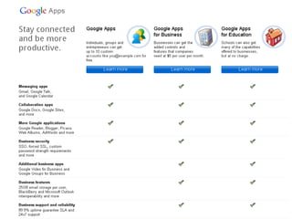 The document provides an overview of various Google apps and services, including features like Google Voice, Google Books, and Google Maps. It highlights capabilities such as personalized content, geolocation services, document collaboration, and tools for blog publishing. Additionally, it mentions Google's privacy policy and ways to manage personal information through the Google dashboard.