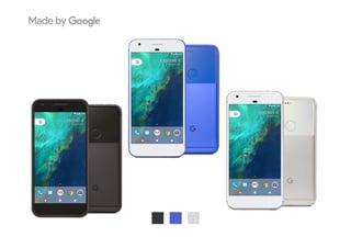 The document summarizes the key features of the Google Pixel and Pixel XL smartphones. It highlights that they have the highest rated smartphone cameras, batteries that last all day, unlimited photo storage, and are the first phones with the Google Assistant built-in. The Pixel and Pixel XL are available in different sizes and colors.