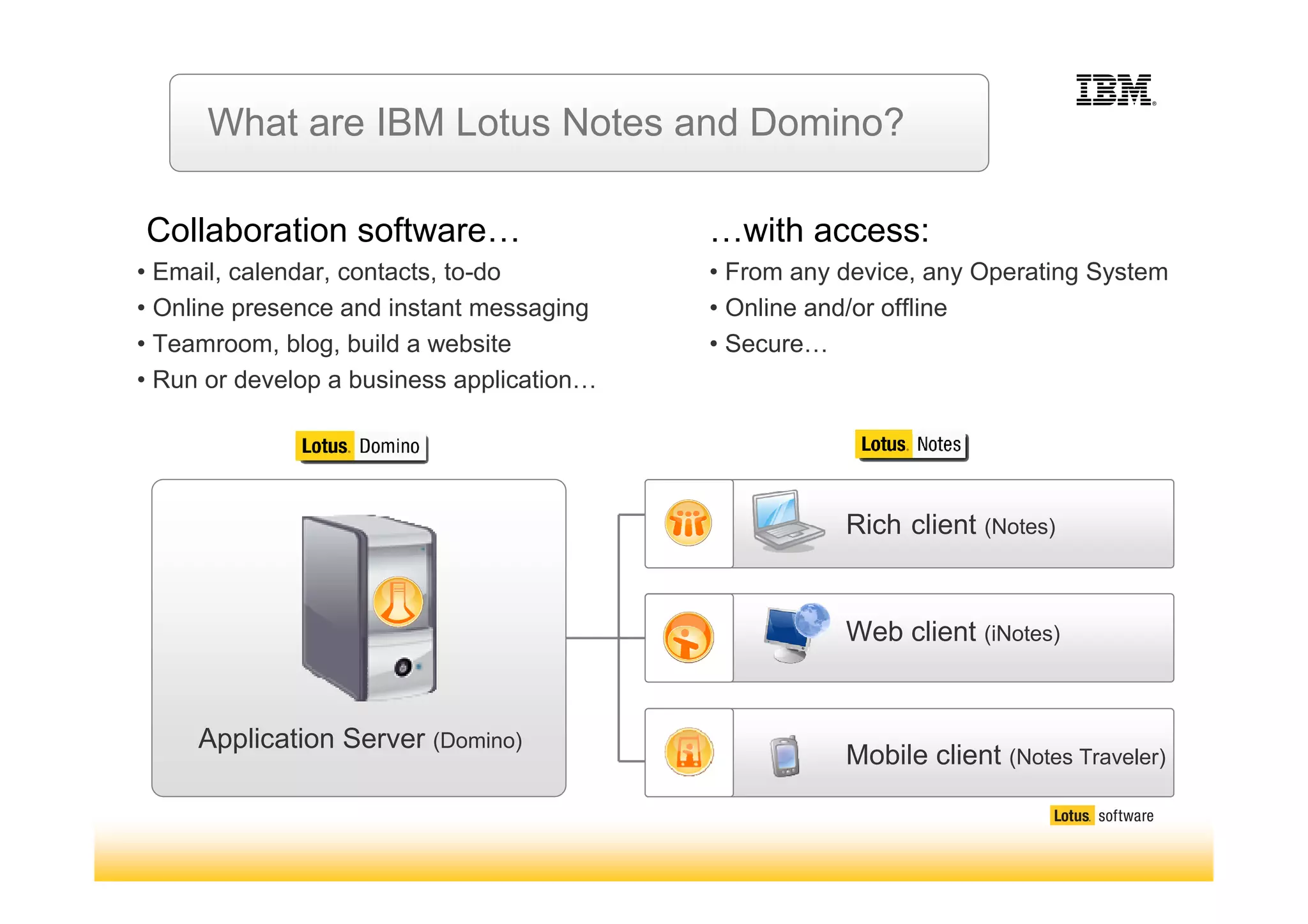 IBM Lotus Notes and Domino 8.5 introduces a social, efficient, and green collaboration platform that enhances productivity by integrating email, calendars, and social networking features across multiple devices. The software supports over 46,000 companies worldwide and emphasizes user-centric collaboration, offering tools for developing business applications and enhanced security measures. Key new features include improved web access, mobile support, and reduced storage requirements, making collaboration more effective and environmentally friendly.