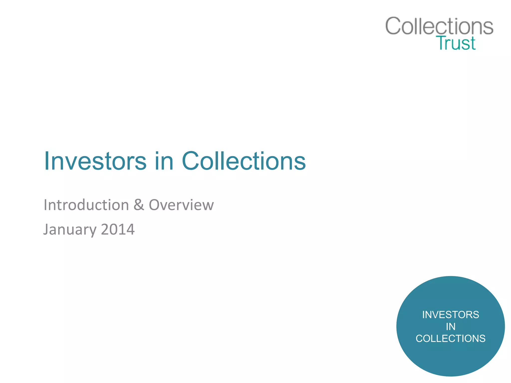 Investors in Collections is a museum development tool facilitating public value and excellence in collections management, providing benefits like improved resilience, accountability, and professional recognition. It follows a structured model that aligns with museum accreditation standards and involves a cycle of self-assessment and peer-review. Resources are offered free of charge, with tiered membership options for recognition and support.