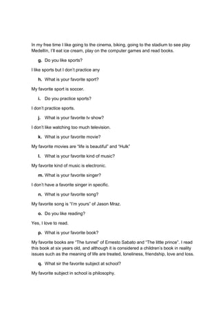 This document introduces Isabel Guerra, a 16-year-old student from Santa Lucía, Colombia. She enjoys going to the cinema, biking, eating ice cream, playing computer games, and reading books in her free time. While her favorite sport is soccer, she does not practice sports regularly. Some of her favorite cultural interests include the movies "Life is Beautiful" and "Hulk", electronic music, and the Jason Mraz song "I'm Yours". She loves reading books like "The Tunnel" and "The Little Prince". Her favorite subjects in school are philosophy, and her favorite teacher is Robinson.