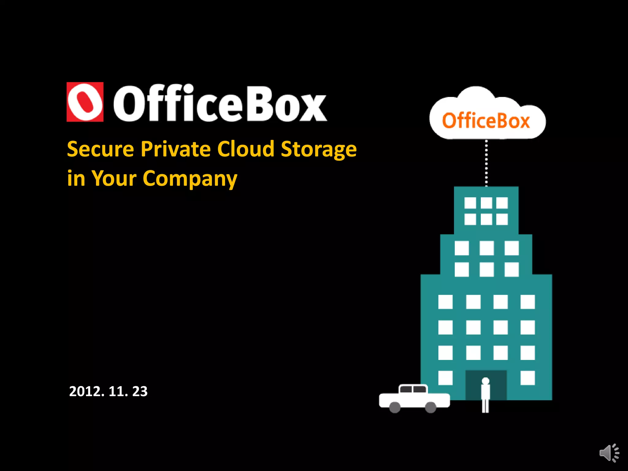 OfficeBox is a private cloud storage solution that allows companies to build their own secure internal cloud. It provides secure access to company data from any device. Key features include real-time monitoring of user and file activity, granular permission controls, and policies to strengthen security like password requirements and automatic file deletion. Files can be easily shared internally through shared folders or externally through guest folders and links. The solution includes a desktop app for direct access without a browser. It offers security and control advantages over public clouds by keeping all company data on-premises.