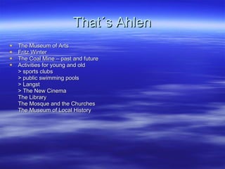 This document introduces English Advanced Course 8 and their first PowerPoint project about Ahlen, Germany and their school, Fritz-Winter-Comprehensive. It provides an overview of attractions in Ahlen like the Museum of Arts, Fritz Winter coal mine, sports clubs, public pools, and landmarks like the library, mosques, churches and Museum of Local History. For their school, it describes the building, important people, a training room, typical schedule, cafeteria and games area.