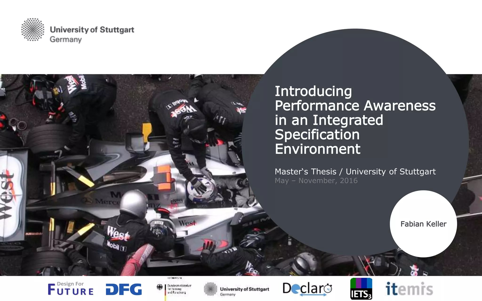 This master's thesis discusses the integration of performance awareness into the software specification process at the University of Stuttgart. It highlights the significance of performance prediction and modeling, the challenges of implementing these concepts in development environments, and a framework for performance analysis through the DECLARE project. The document concludes that while real-time diagnostics and variability analysis are achievable, further analysis for incomplete configurations is still needed.