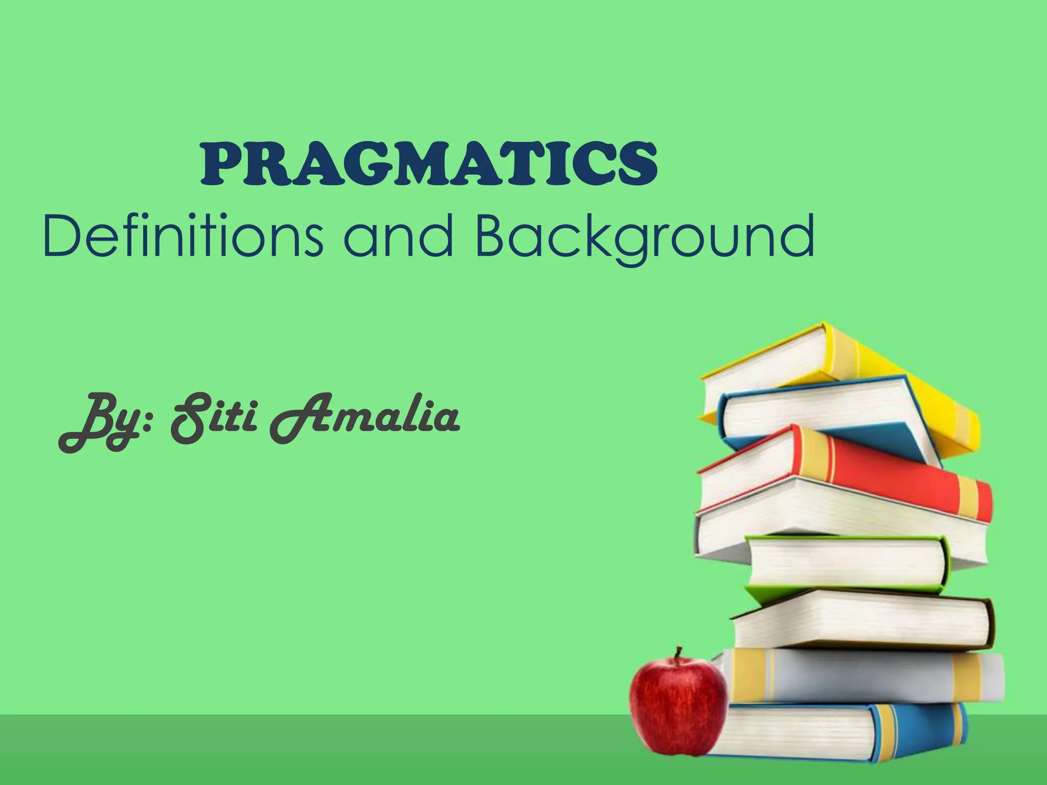 Pragmatics is concerned with 4 main areas: 1) studying a speaker's intended meaning, 2) how context influences meaning, 3) how listeners infer more from what is said than just the literal words, and 4) how the level of closeness between speakers is expressed. It differs from semantics and syntax in that pragmatics considers the relationships between linguistic forms and the users of those forms, allowing human aspects like intentions and assumptions to be analyzed. Studying language through pragmatics allows us to better understand intended meanings but is more difficult to do in an objective, consistent way compared to semantics or syntax.