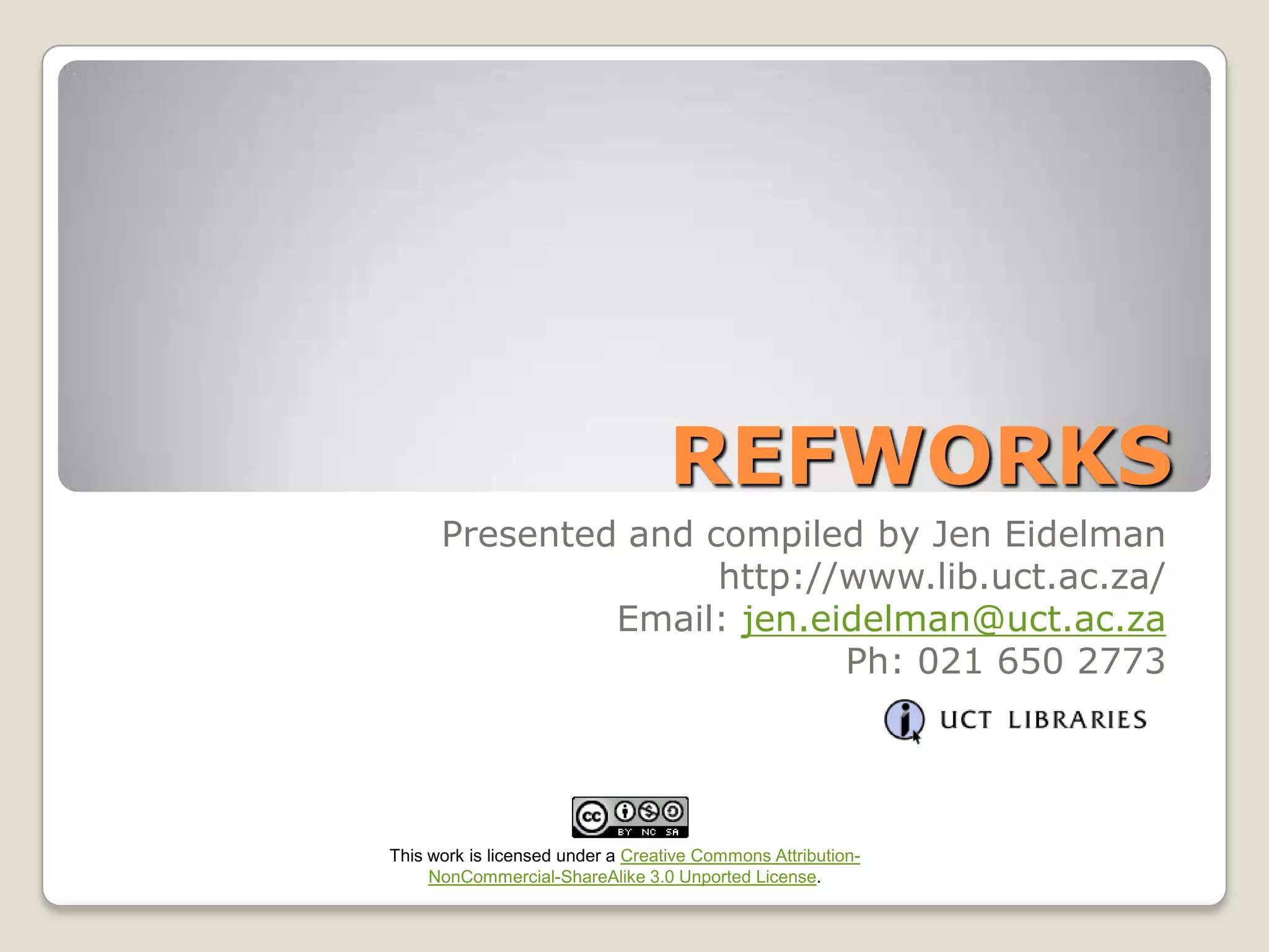 This document provides an overview and instructions for using RefWorks, a citation management tool, and the UCT Harvard referencing style. It begins with an agenda that outlines what will be covered, including how to create a RefWorks account, directly export citations from databases into RefWorks, organize references into folders, create bibliographies from reference lists, and use Write-N-Cite to insert citations into Microsoft Word documents. The document then demonstrates how to find help resources for RefWorks and the referencing style. It provides step-by-step instructions for direct export of citations from databases like Web of Science and GeoRef and importing PDFs. It also shows how to organize references into folders, generate bibliographies from selected references or