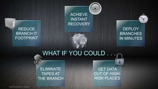 The document introduces SteelFusion, a branch converged infrastructure solution by Riverbed, highlighting its ability to reduce IT footprint, improve data centralization, and enable instant recovery. It outlines key features, including a pre-integrated platform that optimizes performance and consolidates various IT functions. Additionally, the document emphasizes significant improvements in recovery time and total cost of ownership (TCO) through SteelFusion's innovative technologies.