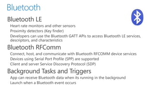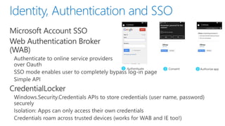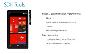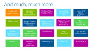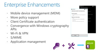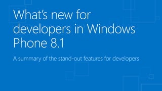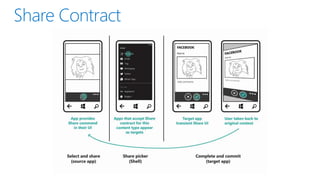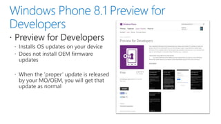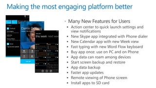 This document discusses the convergence of platforms between Windows and Windows Phone. It outlines several key areas of convergence in Windows Phone 8.1, including the developer platform, apps, and push notifications. The Windows Runtime is now the shared runtime and API space across both platforms. Windows Phone 8.1 allows existing Silverlight apps to take advantage of most new APIs while also enabling developers to build "Universal" apps using shared XAML and HTML/WinJS code that can target both Windows and Windows Phone.