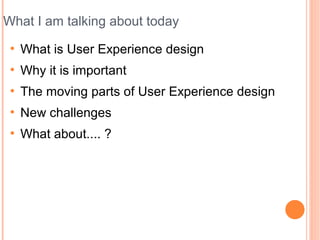 The document introduces user experience design. It discusses what user experience design is, why it is important, and the different parts involved, including purpose, user needs, objectives, strategy, and moving from abstract concepts to concrete design. It addresses new challenges like responsive design and the Internet of things. The conclusion emphasizes designing for user experience, happy customers, and the many steps involved despite challenges.