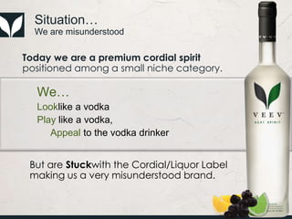 This document outlines plans to reposition VeeV spirit brand from a cordial/liqueur to a vodka alternative. Key points include: