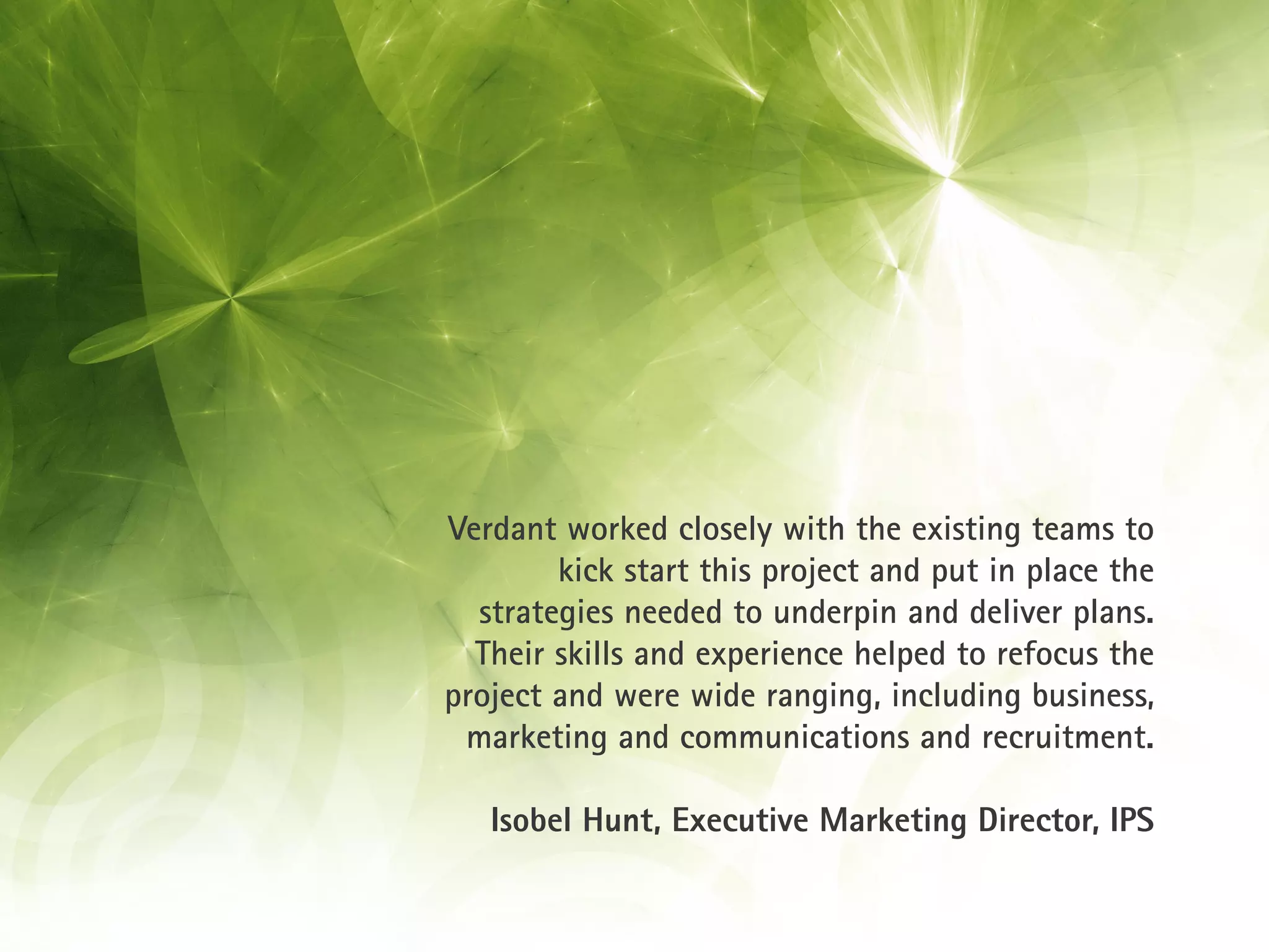 Verdant worked closely with existing teams on a project, providing strategies and refocusing efforts. Their wide-ranging skills in business, marketing, communications, and recruitment helped deliver plans. Isobel Hunt, Executive Marketing Director at IPS, praised Verdant's work. Verdant aims to help organizations improve performance through understanding customers and stakeholders, clear objectives, and creative, measurable results. It offers consultancy, project management, and marketing services across sectors like crime, education, and environment. Clients praise Verdant's professionalism and cost-effective work in fitting needs and taking new approaches.