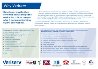 Veriserv is a nationwide compliance services company that has been operating for over 20 years. They provide a wide range of accredited electrical, mechanical, fire, and security services through an experienced team. Veriserv works across many sectors including hotels, education, manufacturing, and retail. They are recognized as industry leaders and offer specialized services like portable appliance testing, fixed wiring inspections, emergency lighting testing, and fire and security installations.
