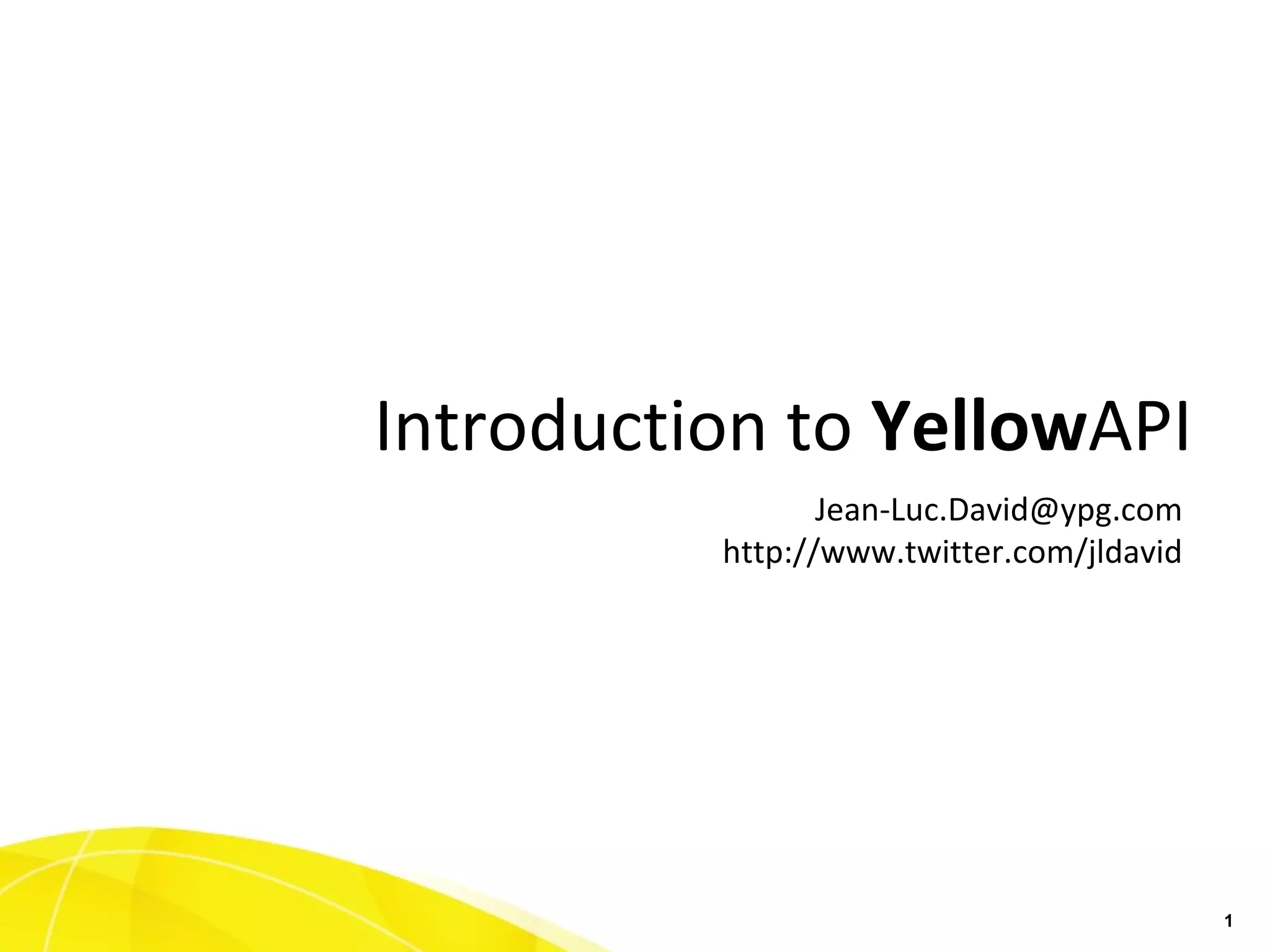 ![[email_address] http://www.twitter.com/jldavid Introduction to Yellow API](https://image.slidesharecdn.com/hackott-110226091346-phpapp01/75/Introducing-YellowAPI-1-2048.jpg)