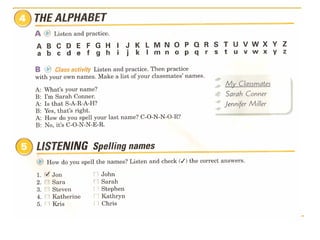 This document introduces several grammar concepts including introducing oneself, asking and answering Wh-questions with be, statements and questions using be, personal pronouns and the verb to be, possessive adjectives, and forming yes/no questions with be. It provides examples of conversations and prompts for practicing these grammar structures through filling in blanks, answering questions based on pictures, and completing paragraphs using the target grammar points.