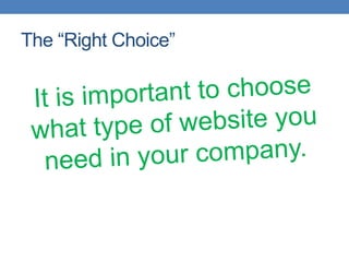 This document discusses different types of websites including static, dynamic, content managed, e-commerce, and flash websites. It notes that static websites are the simplest form and don't use server-side processing, while dynamic websites rely on server-side scripting and databases. Content managed websites allow numerous contributors to add, edit, and remove content through a password protected interface. E-commerce websites can process online transactions like an online store. The document also discusses website content management systems and their features like templates, access control, and collaboration tools.