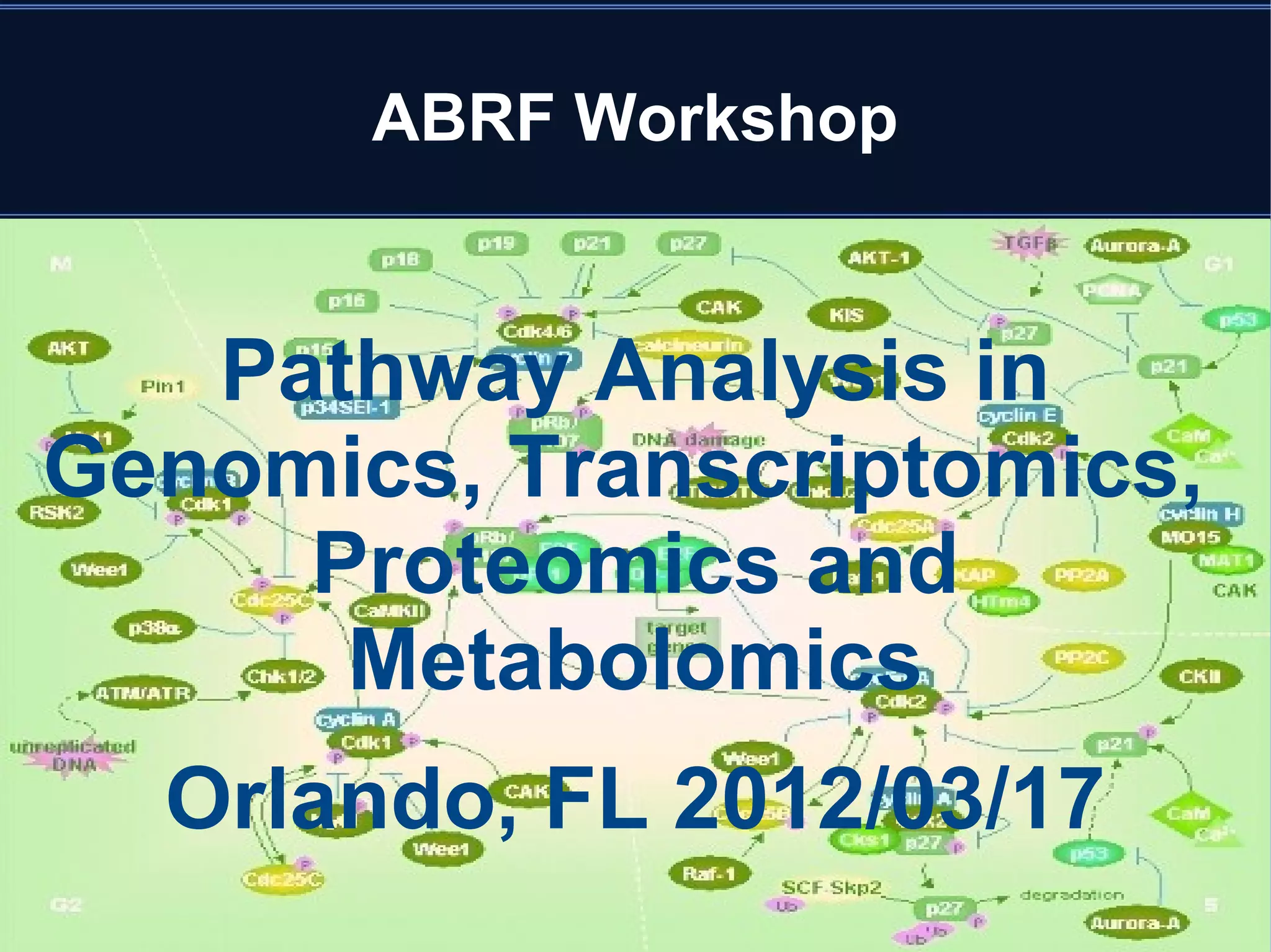 This document summarizes an ABRF workshop on pathway analysis in genomics, transcriptomics, proteomics, and metabolomics. It discusses that pathway analysis (PA) techniques are needed to understand large amounts of "omics" data in the context of biological systems. PA methods take lists of genes and produce reduced lists and models. The document outlines different types of PA tools, issues with training, assumptions that must be verified, and knowledge bases that are used. It also notes limitations of current approaches and the need for new developments like better software, data standards, and validation strategies.