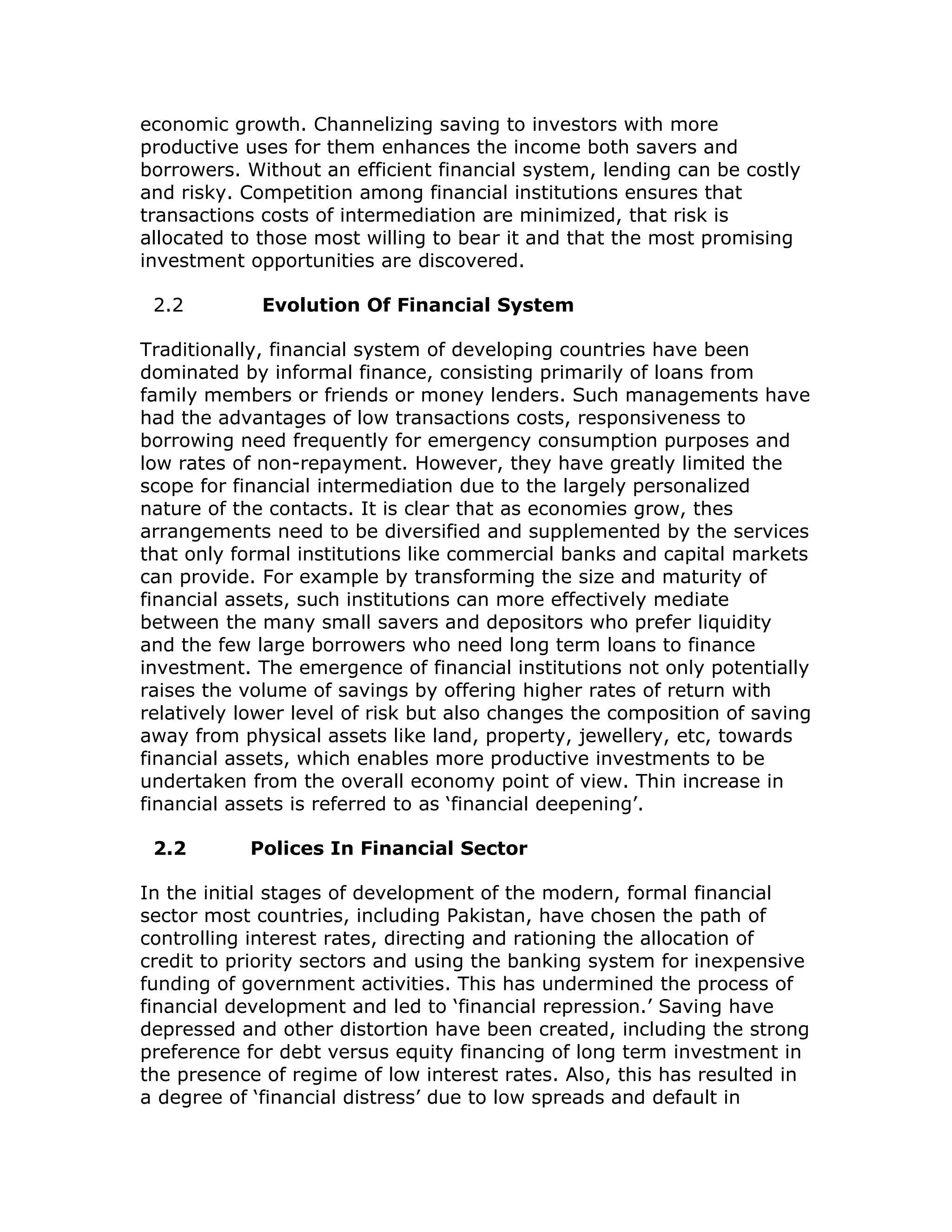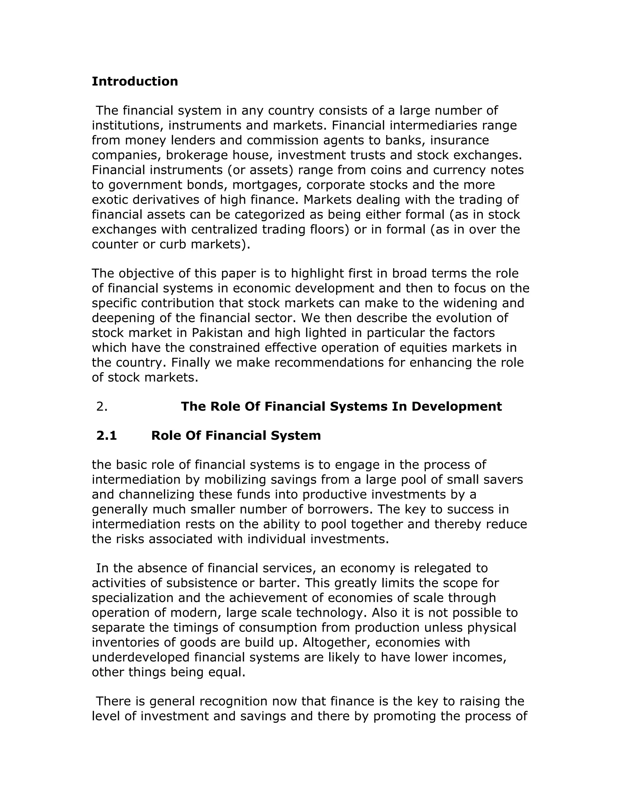 The document discusses the role of financial systems and stock markets in economic development. It provides an overview of Pakistan's financial system, including the historical dominance of informal finance. While financial reforms in recent decades improved access to formal institutions, stock markets remain underdeveloped in Pakistan. The document analyzes constraints like low interest rates, weak regulation, and political instability that have limited stock market growth. It recommends further reforms like reducing corporate leverage, encouraging bond markets, and improving disclosure to strengthen Pakistan's financial system.